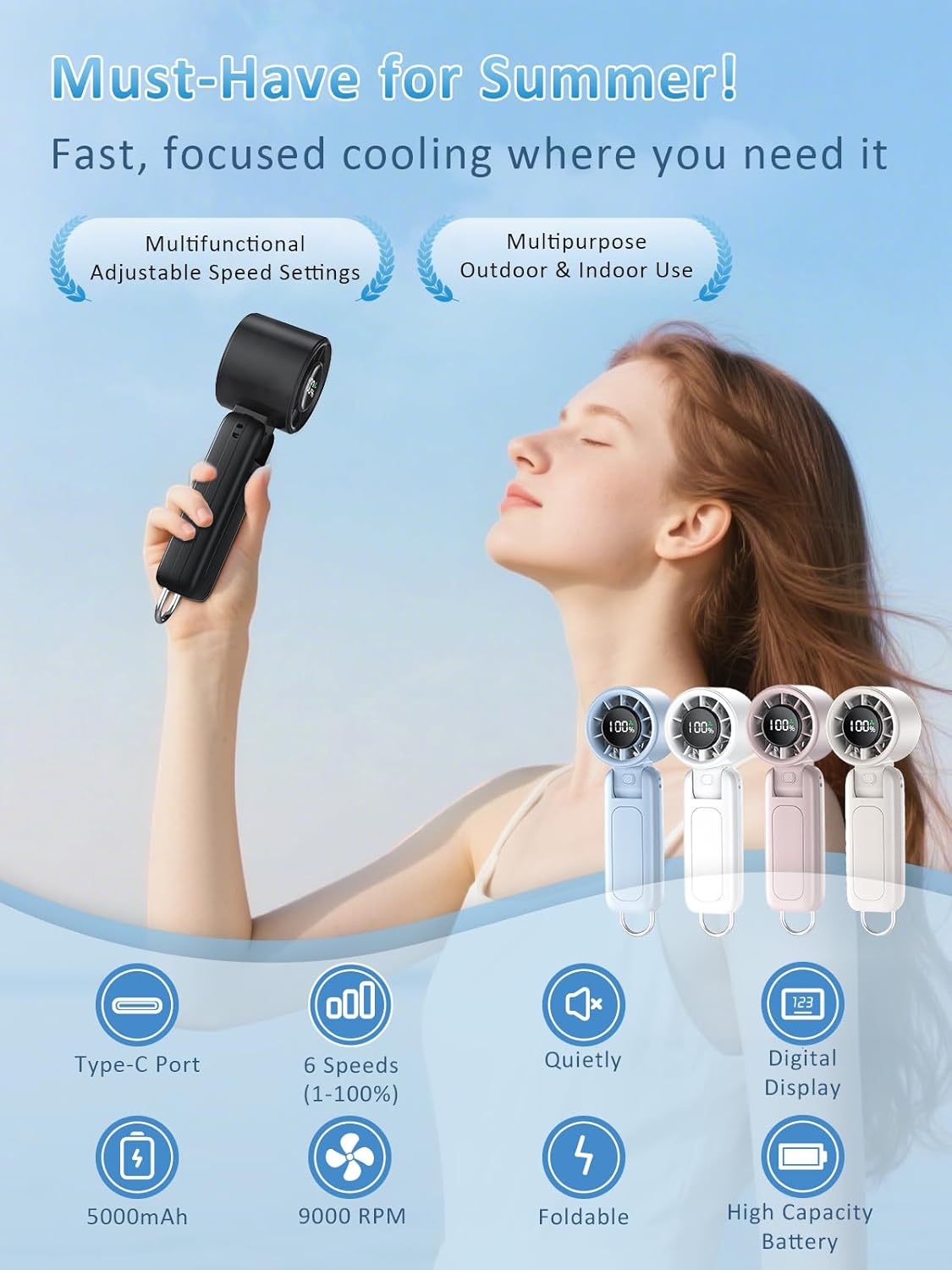 Mitreal 4 in 1 Portable Handheld Turbo Fan, 9000RPM High-Speed Mini, 180° Foldable, 1-100 Speeds, Up to 15H Use, 5000mAh Battery,